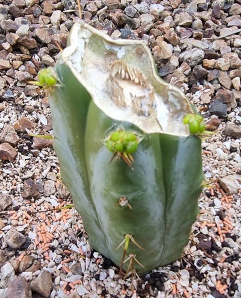 After I cut the tip, something occurred to me which I hadn’t considered before. When you angle the cut in this manner (so water drains away), you remove the connection between the areole and the vascular ring. So maybe now I’ve just shot myself in the foot! However I reassured myself with my True Blue stump on the right. It was cut away in the manner but still managed to form a pup!